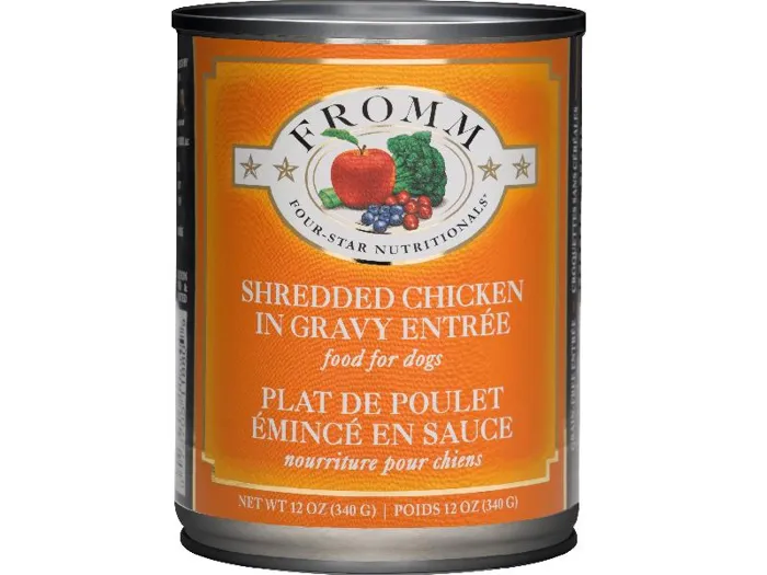 Perfect as a complete meal or accompanying your dog's favorite dry food, Fromm Four Star Shredded Grain Free Chicken in Gravy Canned Dog Food provides balanced and complete nutrition for all breeds and all stages of life. This recipe is made with high quality shredded chicken paired with potatoes, carrots, and beans cooked together in a chicken broth. Fromm Four Star Shredded Grain Free Chicken in Gravy Canned Dog Food is grain free and made with no artificial colors, flavors, or preservatives.
