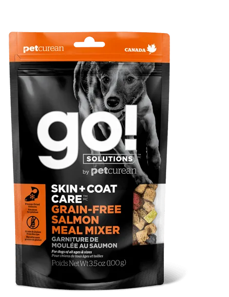 Helps support healthy skin, a shiny coat, and a new attitude. GO! SKIN + COAT CAREโฐรฃยข Salmon Meal Mixer by Petcurean is made with premium-quality salmon, and includes salmon skin, a great source of EPA + DHA Omega-3 fatty acids which help maintain healthy skin and a shiny coat. Mix it into your pet's favourite Petcurean kibble, stew or pฬขtฬฉ, or serve it up as a tasty snack that adds a boost of concentrated nutrition.