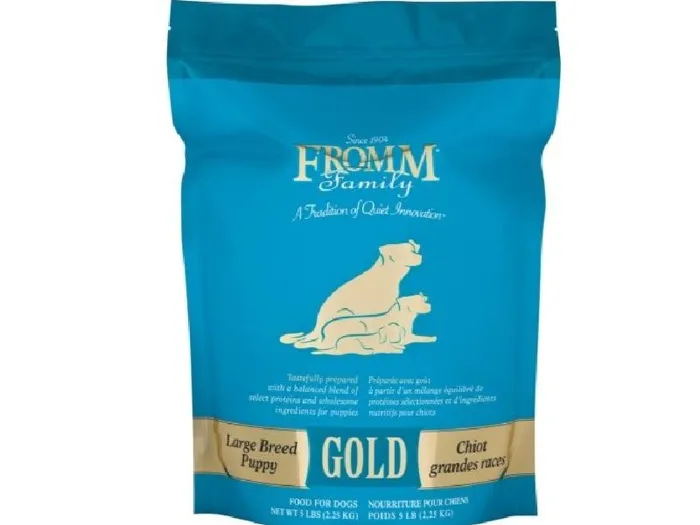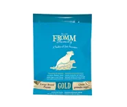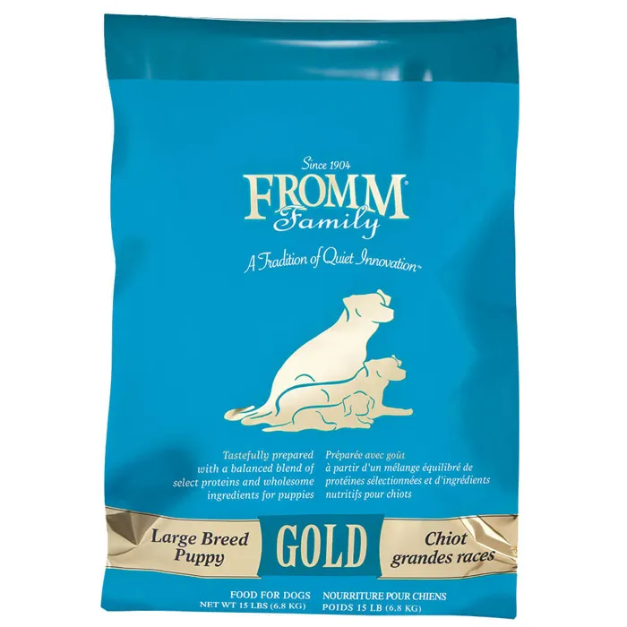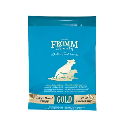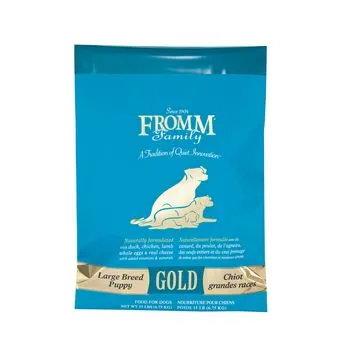Keeping the needs of your large breed puppy in mind, Fromm Gold Large Breed Puppy Dry Dog Food is made to support the needs of those weighing more than 50 pounds in adulthood. Made with high quality protein like chicken and duck paired with fresh produce including potatoes and carrots as well as real Wisconsin cheese, Fromm Gold Large Breed Puppy Dry Dog Food provides well rounded, balanced nutrition for your growing puppy without the unnecessary fillers! This recipe also supports the health of your dog's coat and skin with guaranteed levels of Omega fatty acids and is enhanced with probiotics to ensure that their digestion is right on track! Fromm Gold Large Breed Puppy Dry Dog Food is made with quality ingredients found in the United States with no artificial colors, flavors, or preservatives that any pup is sure to love!