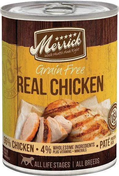 Nourish your pal with the complete and balanced nutrition of Merrick Grain-Free Grammy's Pot Pie Recipe Canned Dog Food. This grain-free stew is made with deboned chicken as the #1 ingredient for good source of protein, fresh-cut vegetables and fruits such as peas, carrots, red-skinned potatoes, and Red Delicious apples for a good source of fiber, vitamins and minerals that will help your pal feel full and satisfied between meals, plus a delicious chicken broth to add moisture and taste. The natural recipe also contains added essential vitamins and minerals for your pal's overall health and well-being. This tasty meal can be served as a kibble topper or as a complete meal. Made safely in the USA in Merrick's own kitchen, this natural recipe does not contain artificial colors, flavors or preservatives.