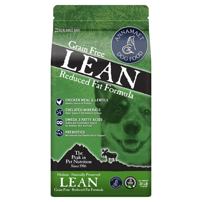 Annamaetรฅรlean formula has half the fat of our other grain free products. In addition to helping dogs with weight concerns, this formula will also work well for large breed puppies and dogs with pancreatitis. Annamaet Lean is formulated to meet the nutritional levels established by the AAFCO dog food nutrient profiles for "ALL LIFE STAGES" (Gestation, Lactation, Growth and Maintenance).