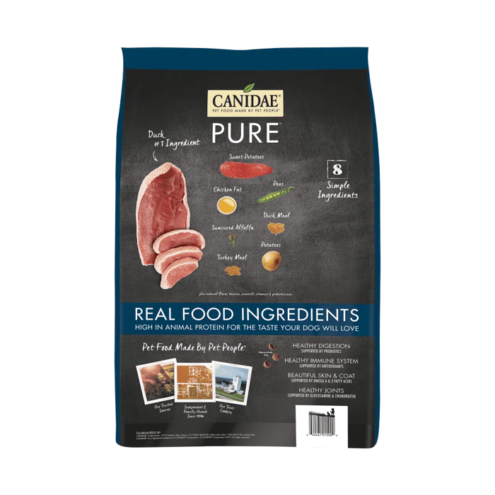 Keep things deliciously simple with CANIDAE Grain-Free PURE Real Duck & Sweet Potato Recipe Dry Dog Food. Using a simple recipe for sensitive dogs, this limited-ingredient diet is made with just eight key ingredients - and even if your dog isn't sensitive to ingredients, he'll still love the great taste. This recipe starts with real duck first and features whole foods like sweet potatoes and peas, plus it's completely free of corn, wheat and soy. Feed your dog all the great taste he craves and all the nutrition he needs.