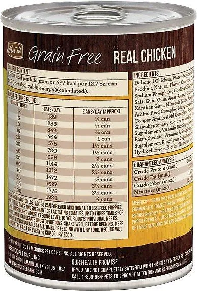 Nourish your pal with the complete and balanced nutrition of Merrick Grain-Free Real Chicken Canned Dog Food. This grain-free stew is made with real deboned chicken for good source of protein, plus a delicious chicken broth to add moisture and taste. The gluten-free recipe also contains added essential vitamins and minerals, such as vitamins E, B12, A and D3, plus a healthy blend of amino acids for your pal's overall health and well-being. This tasty meal can be served as a kibble topper or as a complete meal. Made safely in the USA in Merrick's own kitchen, this natural recipe is great for all adult breeds and does not contain artificial colors, flavors or preservatives.