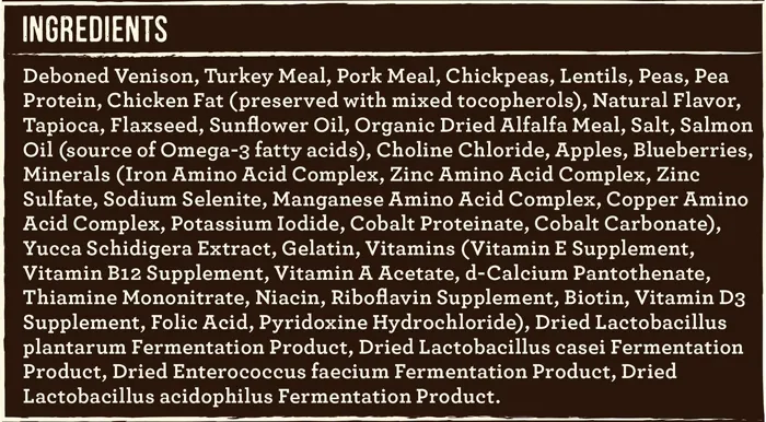 - Deboned venison is the first ingredient, along with real fruits and veggies, for a hearty flavor your best friend will love.