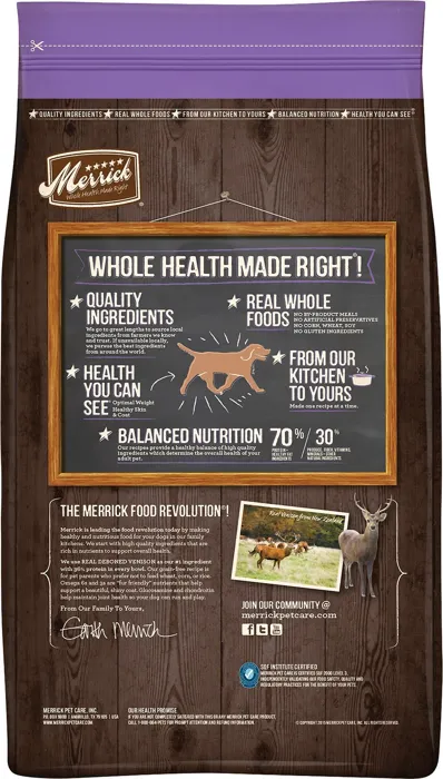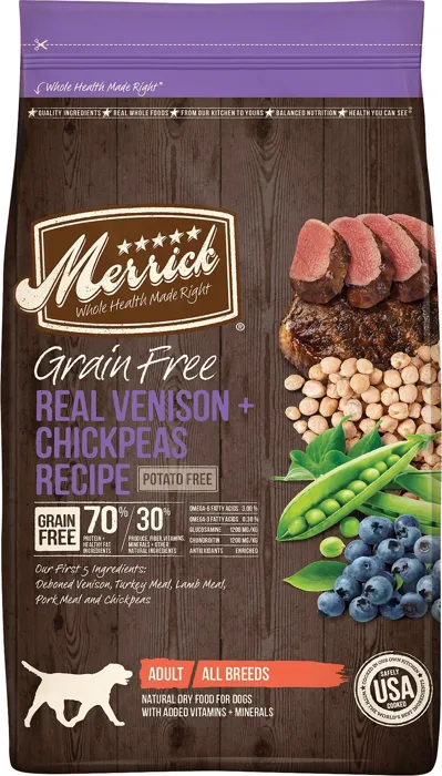 Because the best dog ever deserves the best food ever, Merrick Grain-Free Real Venison + Chickpeas Recipe Dry Dog Food delivers allergy-friendly nutrition with a grain-free recipe that features a novel protein. Deboned venison is the first ingredient for a leading 36% protein, followed by farm-fresh apples and blueberries for powerful antioxidants. Potatoes and other common allergens like corn, wheat, soy and gluten are replaced by chickpeas for a low-glycemic source of energy to fuel your hungry pup. Your dog will also benefit from high doses of glucosamine and chondroitin for increased mobility along with high levels of omega fatty acids for skin and coat health.