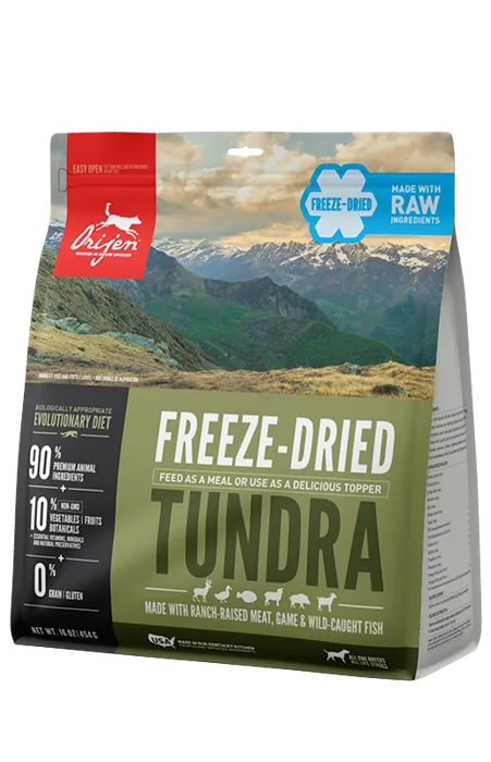 Due to all the processes and add ins to modern kibble, many dog owners are now on the lookout for a return to the natural way of eating. Short of hunting and preparing daily catch, ORIJEN Tundra freeze dried dog food is the closest thing youll find! Formulated with 90% meat ingredients like ranch-raised venison, bison and elk, cage-free duck and quail, steelhead trout for the crucial fats and proteins - the remaining 10% a selection of wholesome fruits and vegetables to provide essential antioxidants and vitamins. All ingredients are delivered fresh and gently freeze-dried in ORIJENs own kitchens without cooking or preservatives, to lock in the natural, life-giving nutrients and flavors abound in a wild diet. Whether provided as your dogs main meal, or a supplement to the dry kibble, your dog will surely benefit from the arrival of new flavors and nutrients in ORIJEN Tundra freeze-dried dog food!