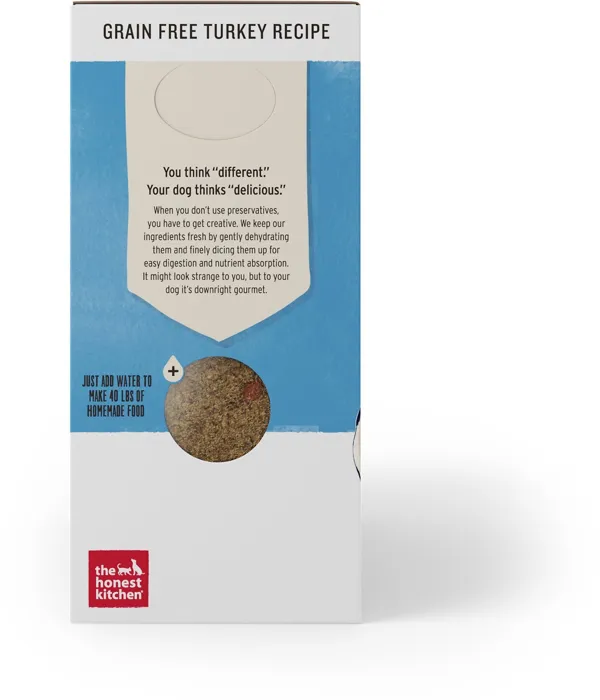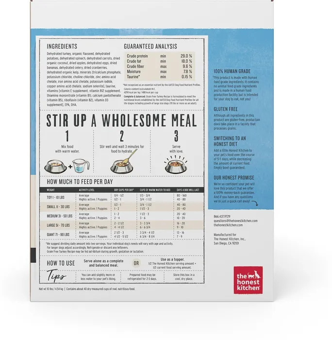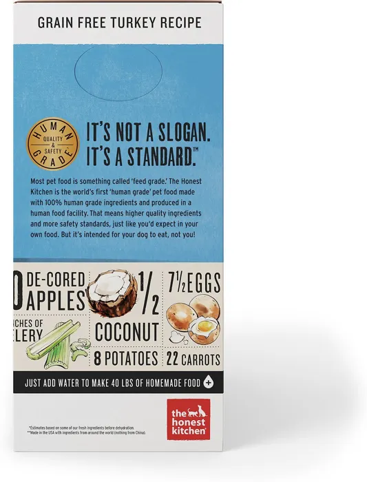 Treat your dog to The Honest Kitchen Grain-Free Turkey Recipe Dehydrated Dog Food - a meal that is both nutritious and delicious! This grain-free dehydrated dog food provides a wholesome meal for puppies and adult dogs. It is packed with 100% real free-range turkey and a variety of fruits and vegetables including coconut, cranberries, spinach, carrots and more! Made without corn, wheat or soy, this grain-free formula is paw-sitively perfect for doggos with food sensitivities. With this human grade recipe produced in a human grade facility, Honest Kitchen proves that you don't have to be a human to eat like one!