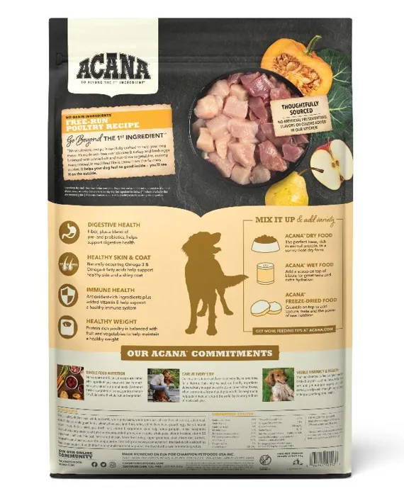 Our ACANAยฎ foods always goes beyond the 1st ingredient, thoughtfully crafting our recipes from start to finish. ACANAยฎ Free-Run Poultry recipe is balanced with 60%* quality animal ingredients like free-chicken and turkey, cage-free eggs, and 40%+ fruits, vegetables, and botanicals. Artificial colors, flavors or preservatives are never added in our kitchen. Our premium ingredients come from a curated group of farmers, ranchers and fishers weโve known and trusted for decades, and we approach every batch with an unsurpassed commitment to safety and quality in our award-winning Kentucky kitchen. The result is a protein-rich, nutritious, and delicious dog food to help them live a healthy, happy life. *approximate and derived from the unprocessed state of the ingredients. +we also add vitamins, minerals, natural preservatives and probiotics.