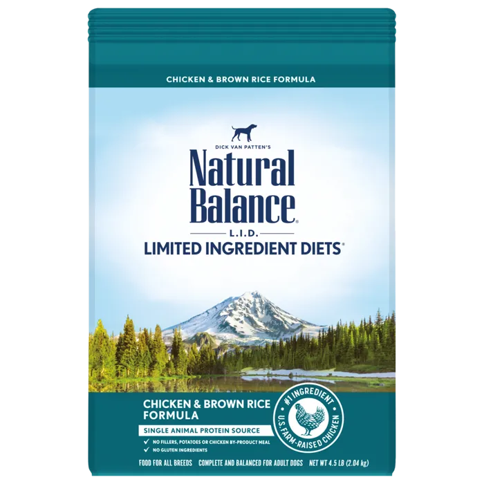 Avoid unwanted additives and help bring out your dog's best with the select, premium ingredients in Natural Balance L.I.D. Limited Ingredient Diets Chicken & Brown Rice Formula Dry Dog Food. This grain-inclusive yet gluten-free premium dog food features USA farm-raised chicken as the first ingredient, which provides amino acids to help maintain strong muscles. Meanwhile, the brown rice contains fiber to help support healthy digestion. And with plenty of essential vitamins and minerals, this delicious chicken and brown rice formula dog food is complete and balanced for adult dogs of all breeds.