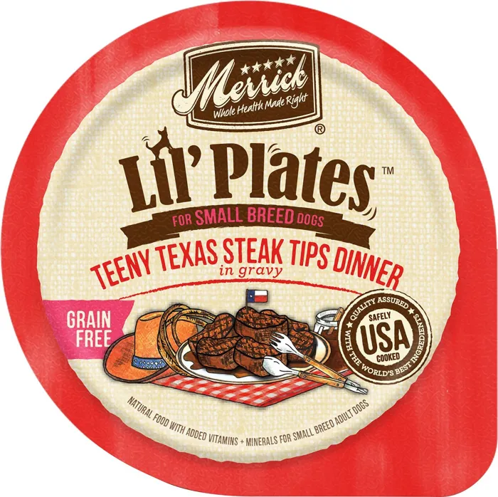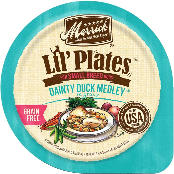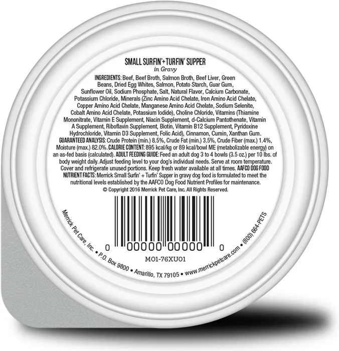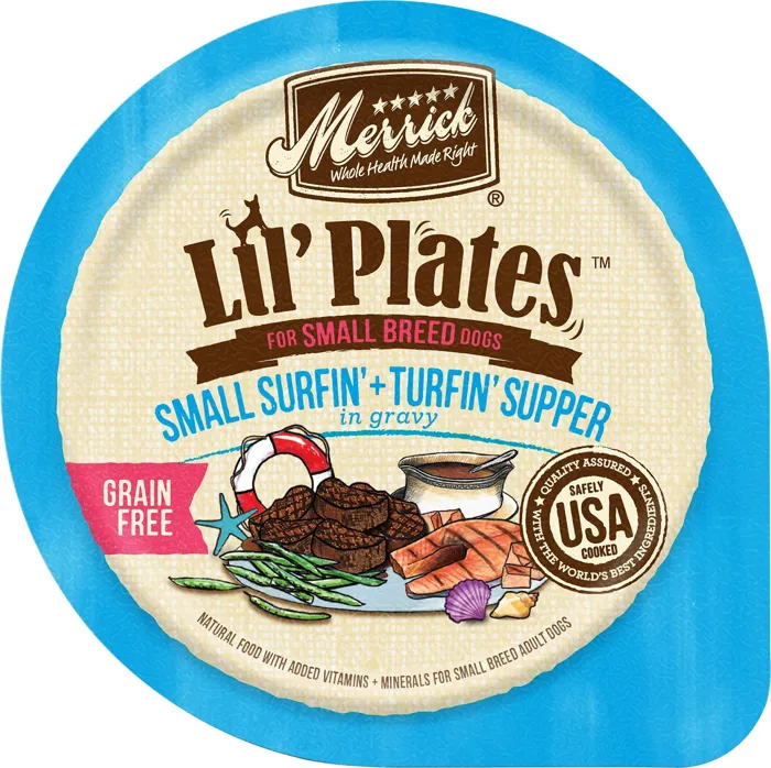 Merrick Lil' Plates Grain-Free Surfin' & Turfin' Supper in Gravy Dog Food Trays cater to the big appetites of small pups. Featuring pieces of real beef and salmon, this high-protein formula gives your pooch a lil' taste of both land and sea with a highly palatable flavor that will make him go wild. Made with real green beans and egg whites in a savory meaty broth, this recipe delivers high-quality grain-free nutrition for a wholesome and balanced diet. The easy-open trays pack all this incredible nutrition into a convenient, single-serving sized container for small-breed dogs.