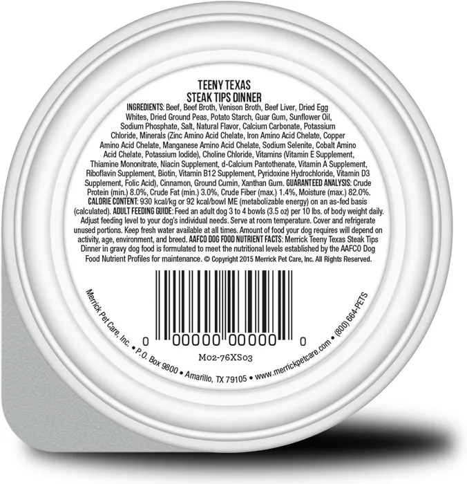 Merrick Lil' Plates Grain-Free Teeny Texas Steak Tips in Gravy Dog Food Trays feature a dog tested taste and texture your tiny pooch will drool for. With succulent pieces containing real beef in gravy, these trays make for a hearty, flavorful meal dogs love. They are 100% grain-free with no gluten ingredients for easy digestibility. The high-protein recipe features moderate fat levels and low carbohydrates, along with egg whites and pea flour in a savory meat broth. The easy-open trays pack all this incredible nutrition into a convenient, single-serving sized container for small-breed dogs.