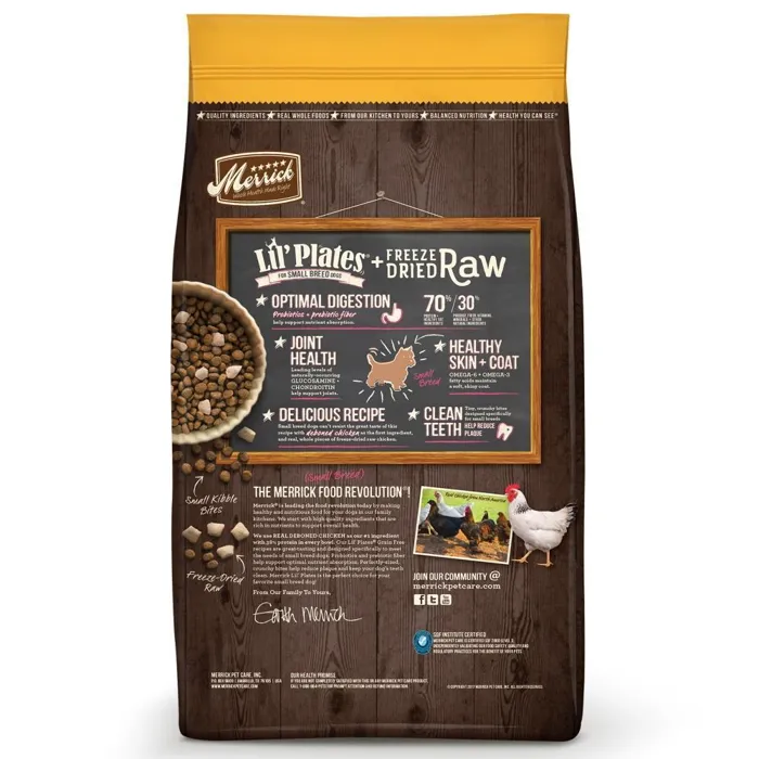Merrick Grain Free Lil' Plates + Freeze Dried Raw Dry Dog Food recipes deliver a perfect combination of protein-rich, grain-free kibble plus real, whole pieces of freeze-dried raw meat for enhanced nutritional benefits and fresh taste of a raw diet in a convenient format for pet parents. Recipes are made in the USA.