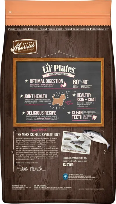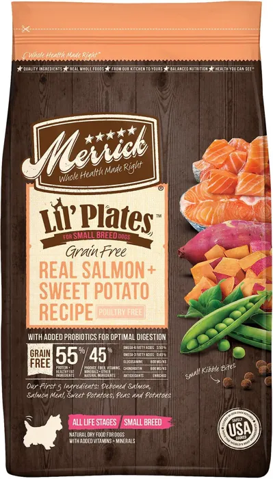 Nourish your pal with the complete and balanced nutrition of Merrick Lil' Plates Grain-Free Real Salmon & Sweet Potato Dry Dog Food. Featuring real, deboned salmon as the first ingredient, it's a great source of protein that helps support your pal's lean muscles. This grain-free recipe is specifically designed to cater to the nutritional needs and appetites of small breeds with smaller kibble. It contains delicious vegetables and fruits, such as sweet potatoes, peas, apples and blueberries for essential vitamins and minerals your furry best friend needs. It also includes flaxseed for a plant-based source of omega 3 fatty acids that help support your pal's healthy skin and coat. Plus, it includes probiotics and prebiotic fiber for optimal and healthy digestion. Made in the USA with no corn, wheat, soy or gluten ingredients, you can feel good about making this your go-to meal.