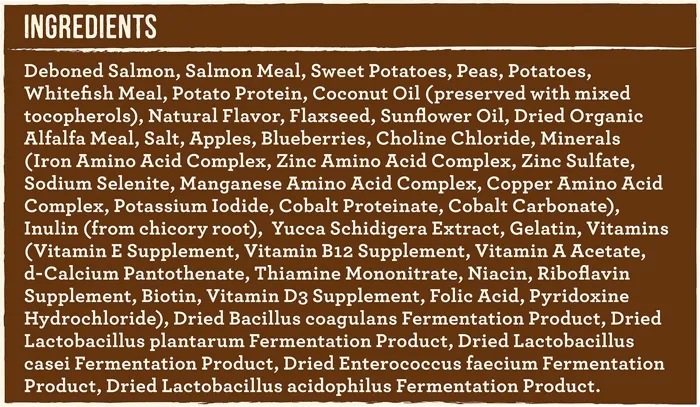 - Grain-free formula with sweet potatoes, peas, apples and blueberries for essential vitamins and minerals your pal needs.