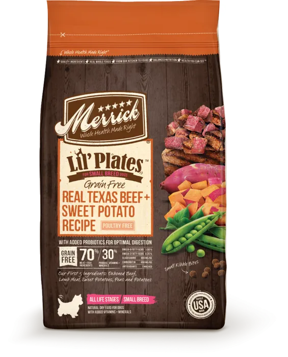 Merrick Lil' Plates Small Breed Grain-Free Real Beef and Sweet Potato Dry Dog Food provides nutrition suited for your small breed pup with real foods sourced from local farmers. 55% of Lil' Plates is composed of meat and healthy fat ingredients that help build and maintain lean, healthy muscle tissue with high quality protein starting with deboned beef. The remaining 45% is made up of fresh produce including easy to digest carbohydrates like potatoes and sweet potatoes which provide sustained energy without upsetting grain-sensitive systems. Merrick Lil' Plates also includes omega fatty acids to promote healthy skin and coat as well as glucosamine to support joint health