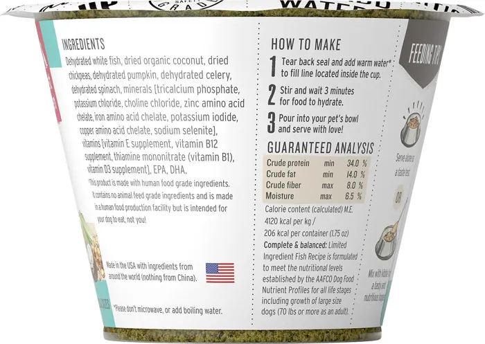 - Dehydrated whole foods maintain their vitamins and minerals so that your furry friend gets all the nutrition he needs - just add water!