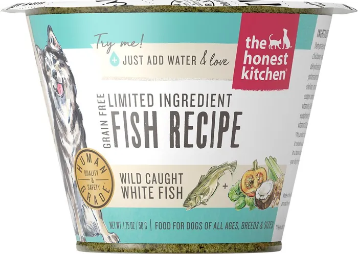 Treat your dog to The Honest Kitchen Limited Ingredient Diet Fish Recipe Grain-Free Dehydrated Dog Food - a meal that is both nutritious and delicious! With just six gluten-free whole foods, this grain-free dehydrated dog food is intended for puppies and adult dogs on a limited ingredient diet. Made without corn, wheat or soy, this limited ingredient doggy food is paw-sitively perfect for doggos with food sensitivities. It is packed with 100% real wild caught white fish and a variety of fruits and vegetables including coconuts, pumpkin, spinach and more! With this human grade recipe produced in a human grade facility, Honest Kitchen proves that you don't have to be a human to eat like one!