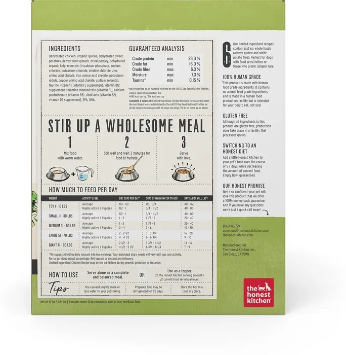 The Honest Kitchen Limited Ingredient Diet Chicken Recipe Grain-Free Dehydrated Dog Food contains a balanced blend of free-range chicken, organic fair-trade quinoa and other wholesome fare. This recipe has only six ingredients, so it's perfect for those with food sensitivities. It's higher in protein and fat than other Honest Kitchen recipes, making it great for puppies and active adult dogs. Plus, it's a naturally low-carbohydrate food that's great for dogs with food allergies or those who just need a simplified diet.