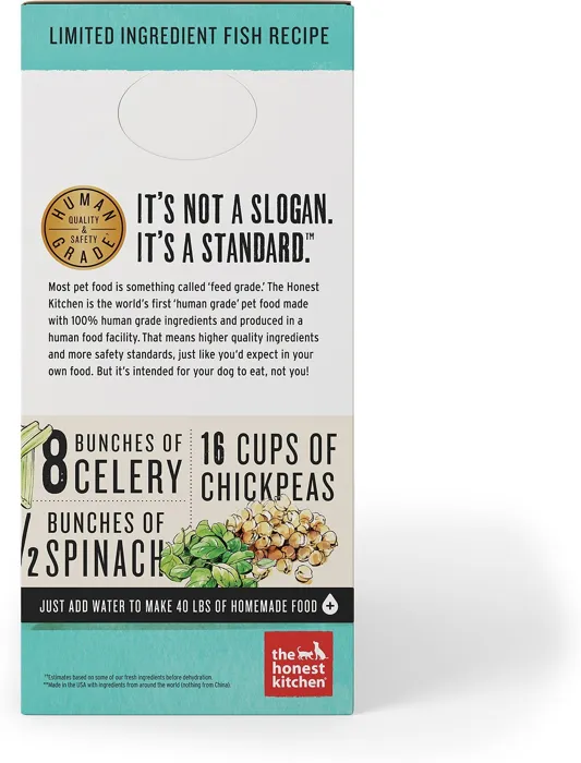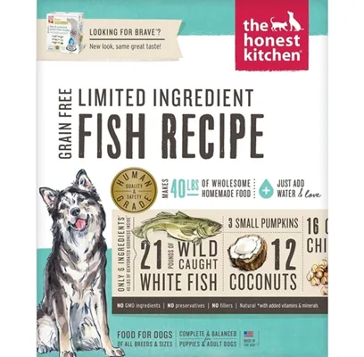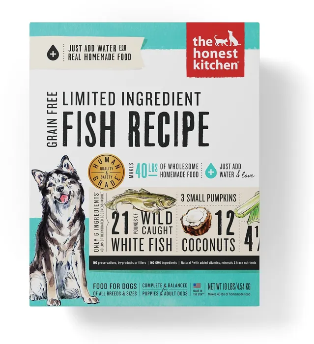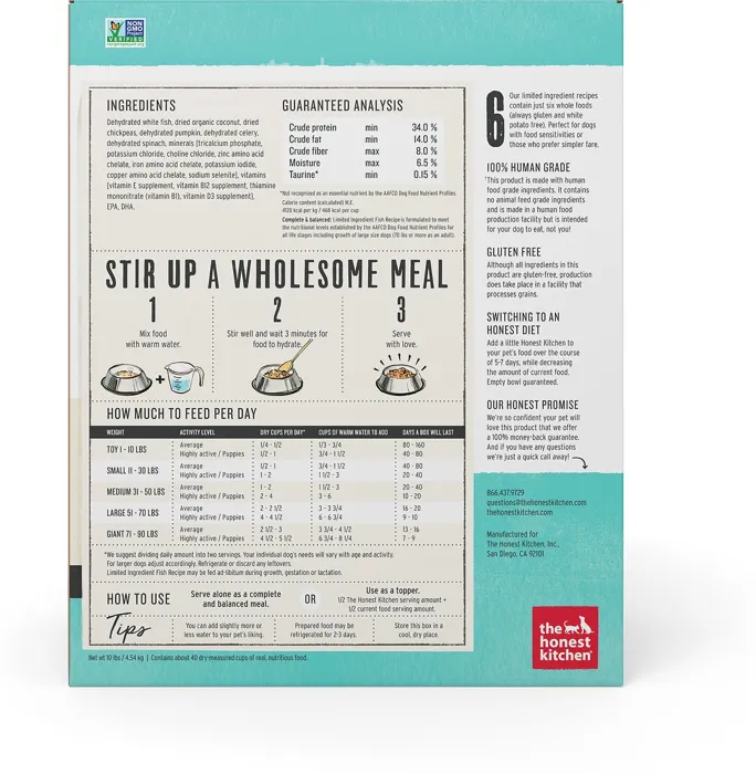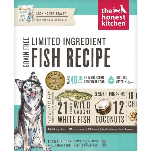Treat your dog to The Honest Kitchen Limited Ingredient Diet Fish Recipe Grain-Free Dehydrated Dog Food - a meal that is both nutritious and delicious! With just six gluten-free whole foods, this grain-free dehydrated dog food is intended for puppies and adult dogs on a limited ingredient diet. Made without corn, wheat or soy, this limited ingredient doggy food is paw-sitively perfect for doggos with food sensitivities. It is packed with 100% real wild caught white fish and a variety of fruits and vegetables including coconuts, pumpkin, spinach and more! With this human grade recipe produced in a human grade facility, Honest Kitchen proves that you don't have to be a human to eat like one!
