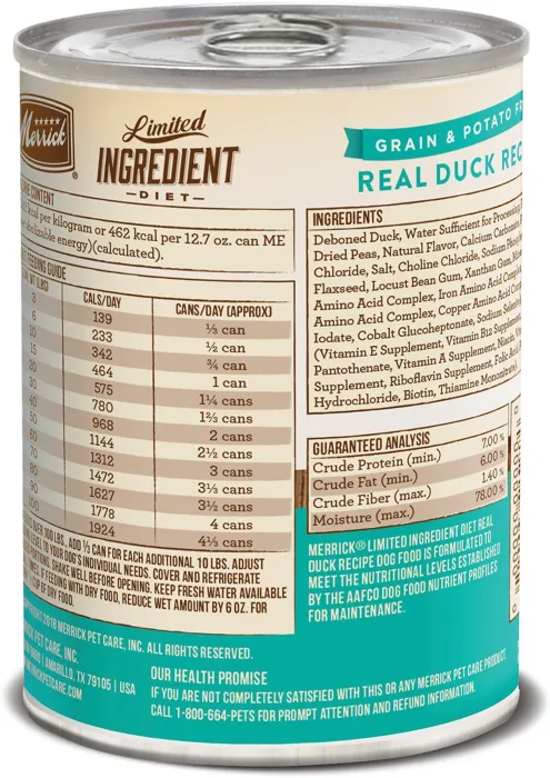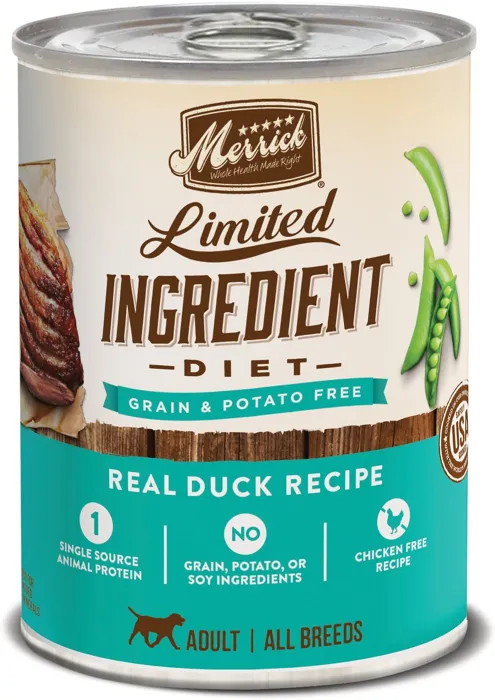 Merrick Limited Ingredient Diet dog food recipes are specially formulated with a limited number of carefully selected ingredients to provide complete and balanced nutrition for dogs with food sensitivities and sensitive stomachs. Merrick's limited ingredient recipes keep it simple with a single source of animal protein, a first ingredient of real deboned meat, fish, or poultry, and easily digestible carbohydrates, without grains, corn or gluten ingredients.
