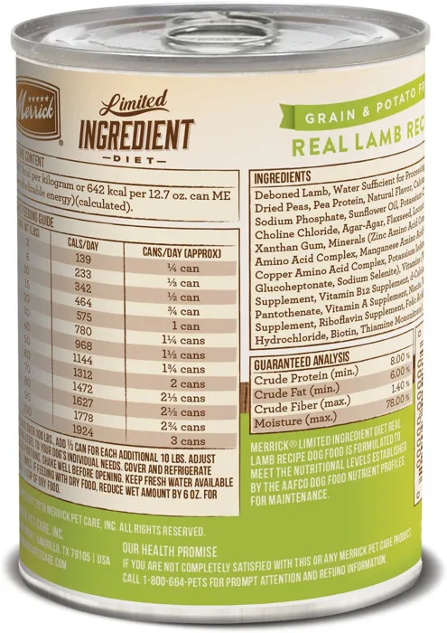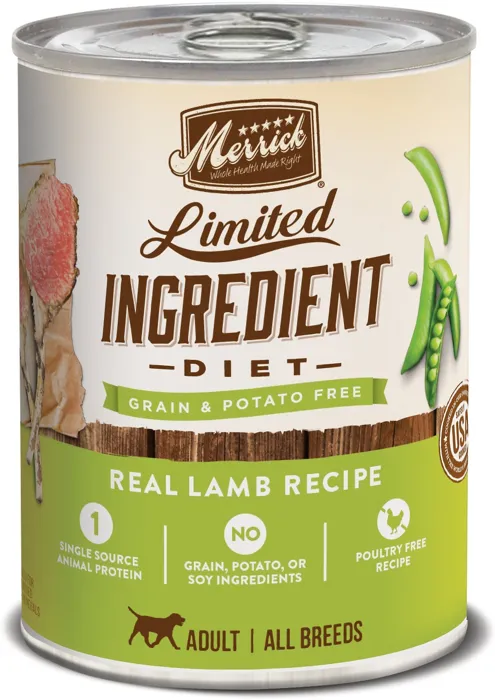 Merrick Limited Ingredient Diet dog food recipes are specially formulated with a limited number of carefully selected ingredients to provide complete and balanced nutrition for dogs with food sensitivities and sensitive stomachs. Merrick's limited ingredient recipes keep it simple with a single source of animal protein, a first ingredient of real deboned meat, fish, or poultry, and easily digestible carbohydrates, without grains, corn or gluten ingredients.รฅร