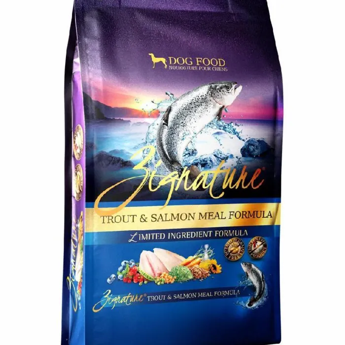 Fill your best friend's bowl with wholesome nutrition when you feed them Zignature Trout & Salmon Meal Limited Ingredient Formula Grain-Free Dry Dog Food. Your pup will enjoy a delicious dinner made with real Trout and Salmon from the Northwestern USA, wholesome peas, chickpeas, and flaxseed. This meat-first recipe offers pups the protein they need to thrive, while Zignature's limited ingredient recipe throws out troublesome ingredients like chicken, corn, wheat, soy, and potatoes, creating peak hypoallergenic, low-glycemic nutrition. Combine that with key antioxidants, essential fatty acids, and a complete spectrum of vitamins and minerals for a well-rounded meal that goes beyond nature to become your pet's signature food for life.