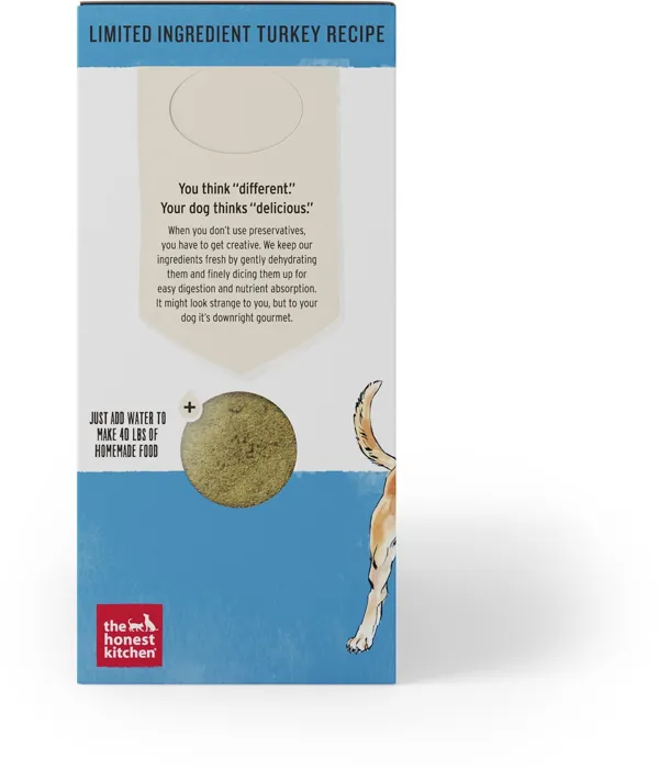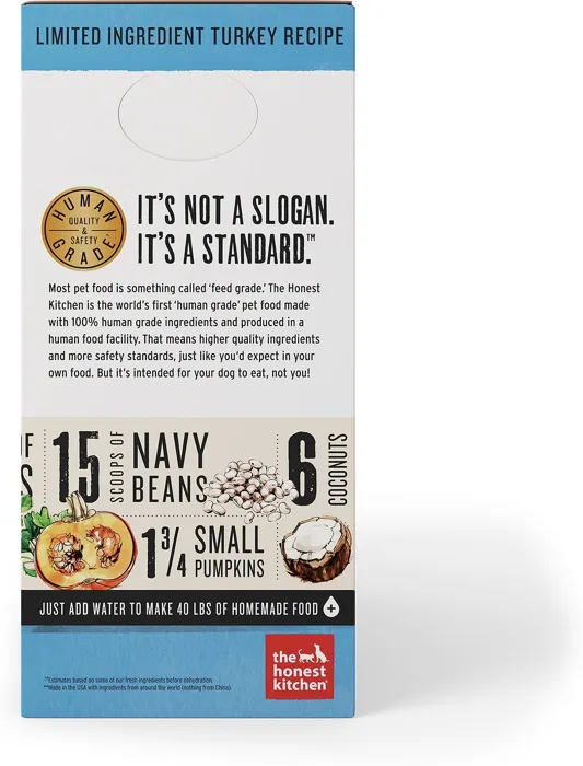 Treat your dog to The Honest Kitchen Limited Ingredient Diet Turkey Recipe Grain-Free Dehydrated Dog Food - a meal that is both nutritious and delicious! With just six gluten-free whole foods, this grain-free dehydrated dog food is intended for adult dogs on a limited ingredient diet. Made without corn, wheat or soy, this limited ingredient doggy food is paw-sitively perfect for doggos with food sensitivities. It is packed with 100% real free-range turkey and a variety of fruits and vegetables including coconut, pumpkin, parsnip and more! With this human grade recipe produced in a human grade facility, Honest Kitchen proves that you don't have to be a human to eat like one!