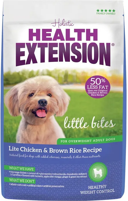 Make mealtime holistically nutritious with the Health Extension Lite Little Bites Dry Dog Food. Specially formulated to meet the needs of small breed overweight, spayed, neutered or senior dogs, it's made with organic, free-range chicken as the first ingredient, plus whole foods like brown rice, oatmeal, and lamb. Designed to provide a balanced diet as well as promote overall health, it also has superfoods like flaxseeds, milk thistle, cranberry extract, primrose oil, kelp, green tea, and blue-green algae. Plus, it has probiotics for tummy health, CoQ10 to support heart health, and a balanced blend of omega-3 and 6 fatty acids. The hypoallergenic, anti-hypoglycemic formula is made with no added sugar and never any gluten, corn, wheat, soy, by-products, artificial preservatives or colors.