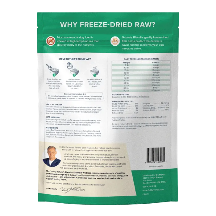 Dr. Marty's Natureโs Blend โ Essential Wellness is designed to support your dogโs youthful energy, easy digestion, healthy teeth and skin, mobility, and healthy lifespan. Each batch is made from premium meats, veggies, fruit and seeds โ and contains zero artificial preservatives, additives, fillers, or synthetic ingredients.