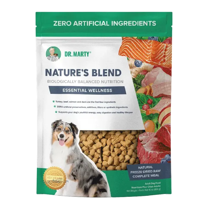 Dr. Marty Nature's Blend is.a premium, freeze-dried raw dog food formulated to support the health, happiness, and longevity of all adult dogs.
