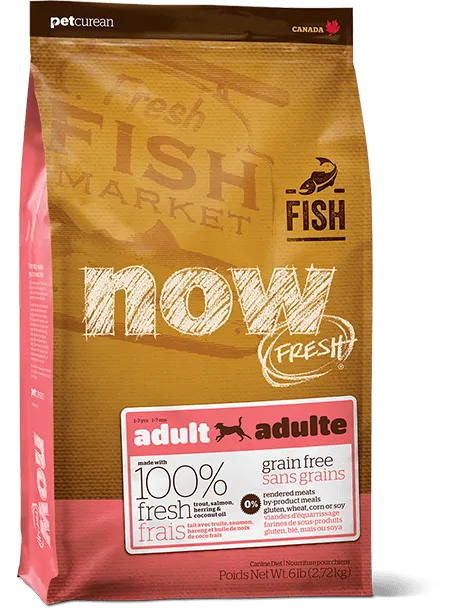 NOW FRESHโฐรฃยข Grain Free FISH Recipe for Adult Dogs is made with 100% FRESH trout, salmon, herring, and 100% fresh Omega 3 & 6 oils from coconuts and canola. NOW FRESHโฐรฃยข Grain Free FISH also features zero grains, gluten, wheat, beef, corn or soy. Zero rendered meats, by-products or artificial preservatives.