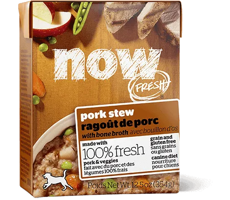 NOW FRESHโฐรฃยข Grain Free Pork Stew with bone broth is made with 100% FRESH pork and salmon and 100% fresh Omega 3 & 6 oils from coconuts and canola. NOW FRESHโฐรฃยข also features zero grains, gluten, wheat, beef, corn or soy. Zero rendered meats, by-products or artificial preservatives.