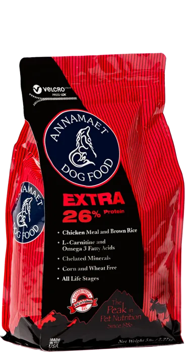 Annamaet Extra is a corn, wheat, and soy free formula with extra fat, making it even more appealing to active dogs, canine athletes, working dogs and bully breeds. This formula is made with low ash chicken and brown rice. Annamaet Extra is formulated to meet the nutritional levels established by the AAFCO dog food nutrient profiles for "ALL LIFE STAGES" (Gestation, Lactation, Growth and Maintenance).