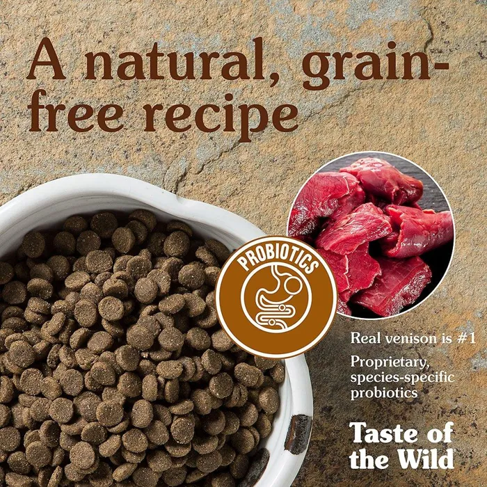 Nourish your canine companion with the balanced diet nature intended with Taste of the Wild Pine Forest Grain-Free Dry Dog Food! Formulated with novel proteins including venison, this grain-free recipe includes nutrient-rich legumes like peas and garbanzo beans that deliver the highly-digestible energy your pal needs, along with natural antioxidant support from real fruits and vegetables and dried chicory root for prebiotic support and healthy digestion. Essential minerals are chelated with amino acids to optimize their absorption and ensure maximum benefit, for complete and balanced nutrition with a taste of the wild your furry friend constantly craves!