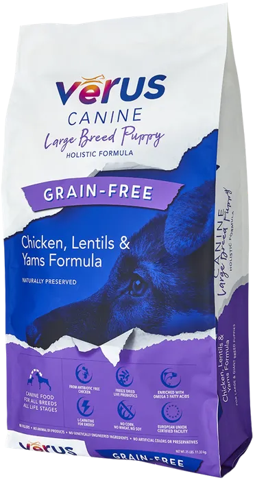 Verus Large Breed Puppy Chicken, Lentils & Yams Holistic Formula is a unique combination of fresh meats, vegetables and legumes. It is designed for dogs up to 20 months old and 70 pounds or more at maturity.