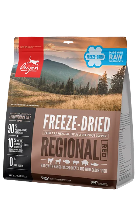 As we learn more about a dog's natural diet, many pet parents are looking for the best way to provide the most natural diet possible. Short of hunting and preparing daily catch, ORIJEN Regional Red Freeze-Dried dog food is the closest thing youll find! Regional Red Freeze-Dried is formulated with 90% meat ingredients, all local and ranch raised like Black Angus beef, wild boar, lamb and heritage pork and bison for the crucial fats and proteins, with the remaining 10% a selection of wholesome fruits and vegetables to provide essential antioxidants and vitamins. All ingredients are delivered fresh and gently freeze-dried in ORIJENs own kitchens without cooking or added preservatives to lock in the natural, life-giving nutrients and flavors abound in a wild diet. Whether provided as a main meal, or a supplement to their kibble, dogs will surely benefit from the arrival of new flavors and nutrients in ORIJEN Regional Red Freeze-dried dog food!