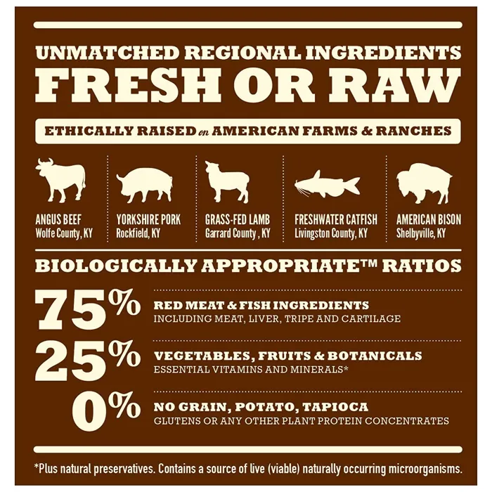 - Regionally inspired dry cat food packed with ranch-raised beef, Yorkshire pork, grass-fed lamb, American bison, and freshwater catfish