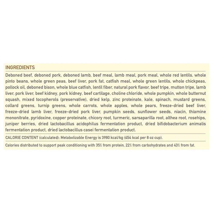 - 75% premium animal ingredients in nourishing WholePrey ratios; 25% vegetables, fruits, and botanicals