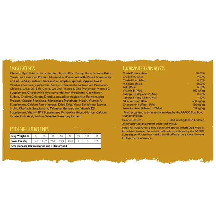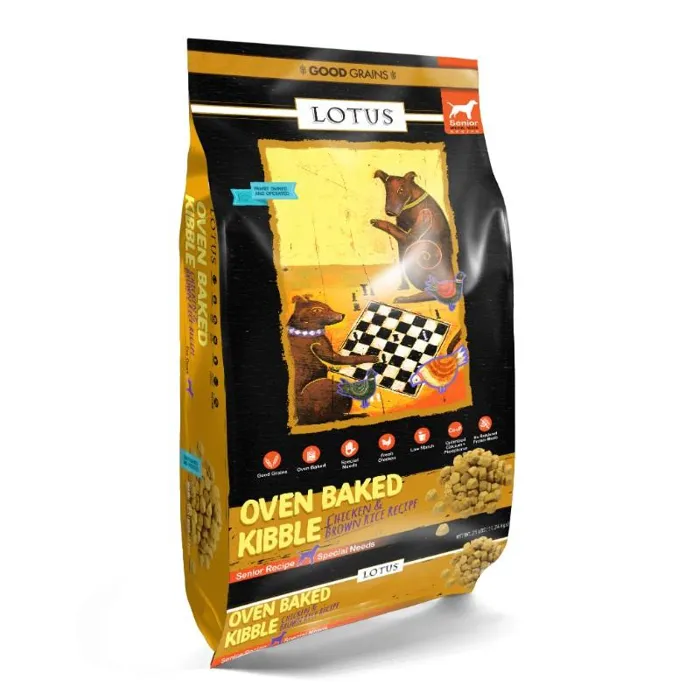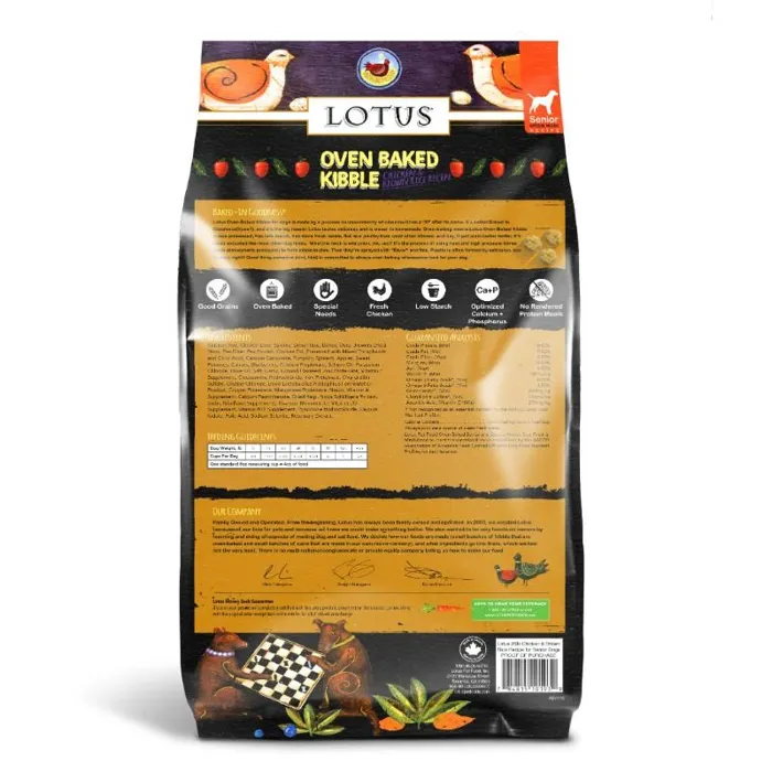 Feed your senior sidekick the nutrition she needs with the scrumptious flavor she loves! Lotus Wholesome Senior Recipe is an oven-baked kibble that combines real chicken, chicken liver, sardines, brown rice and recognizable fruits and vegetables for a balanced meal. The beneficial blend of olive and salmon oils provides your dog with healthy omega fatty acids, while vitamins, antioxidants and nutrients help support her overall health. Plus, this kibble tastes just like an oven-baked chicken cookie that your canine companion won't be able to resist!