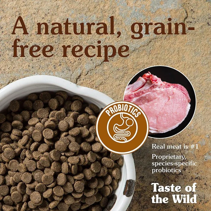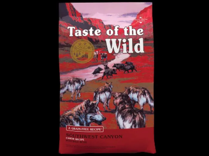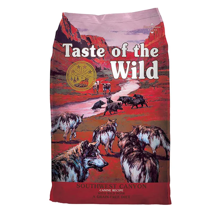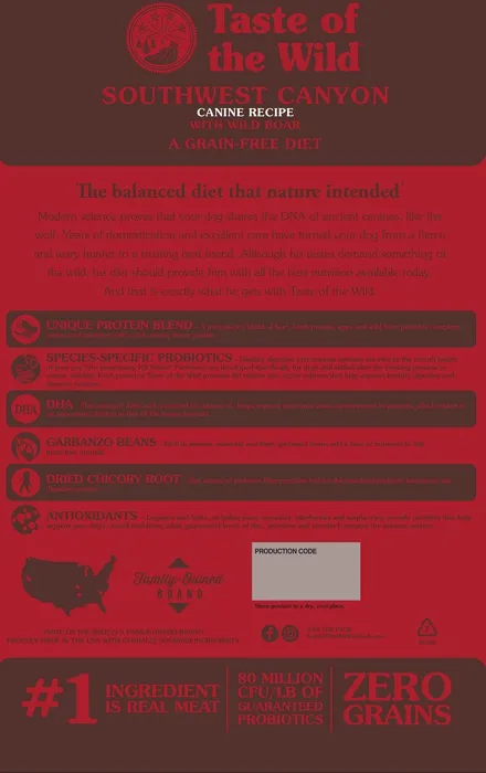 Nourish your canine companion with the balanced diet nature intended with Taste of the Wild Southwest Canyon Grain-Free Dry Dog Food! Formulated with novel proteins including wild boar, this grain-free recipe includes nutrient-rich legumes like peas and garbanzo beans that deliver the highly-digestible energy your active pup needs, along with natural antioxidant support from real fruits and vegetables and dried chicory root for prebiotic support and healthy digestion. Essential minerals are chelated with amino acids to optimize their absorption and ensure maximum benefit, for complete and balanced nutrition with a taste of the wild your furry friend constantly craves!