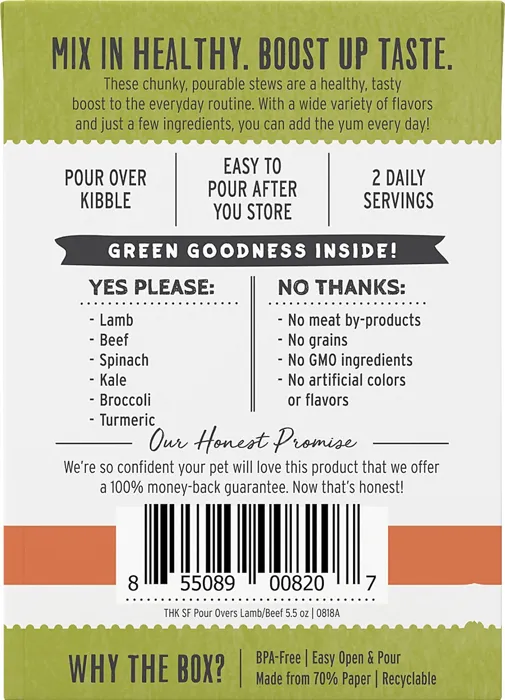 Jazz up your canine's dry dog food with The Honest Kitchen Pour Overs Stew Wet Dog Food Topper. Made with just nine ingredients including beef bone broth, lamb, beef, spinach, kale and broccoli this recipe serves as a delicious and nutritious stew that's pourable too! Every Pour Overs topper is specially designed for intermittent or supplemental feeding only. With a wide variety of flavors to choose from, each slow-cooked stew is grain-free and made with 100% natural ingredients you can trust and all the tail-wagging taste your dog will love!