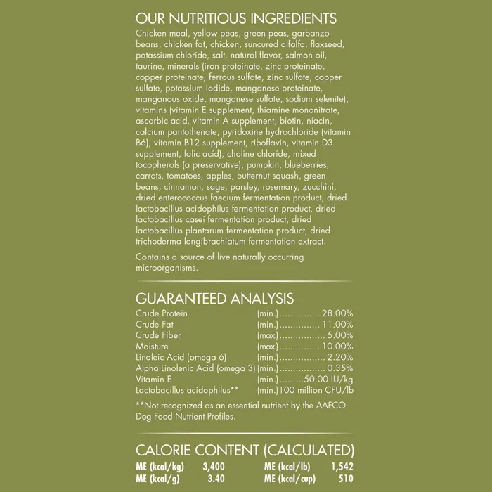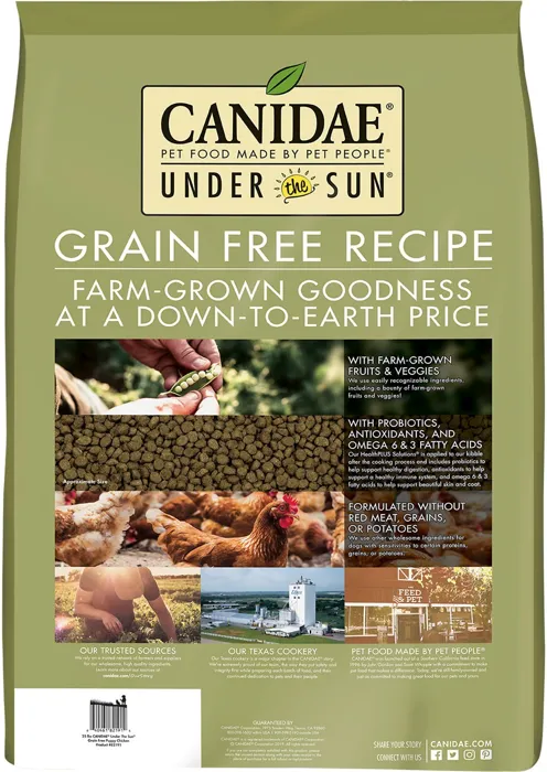 Start your new best friend off right with the wholesome goodness of Under the Sun Grain-Free Chicken Recipe Puppy Dry Dog Food. Based on the philosophy that good ingredients make good food, this grain-free and potato-free recipe for puppies is made in the USA with a single animal protein, for sensitive pups, along with a bounty of fruits and veggies including peas, green peas, garbanzo beans,blueberries, butternut squash and more! And with probiotics to encourage healthy digestion, antioxidants to help support healthy immunity, and omega-3 and omega-6 acids to promote healthy skin and a shiny coat, you can feel good knowing that this recipe is just as nutritious as it is delicious!