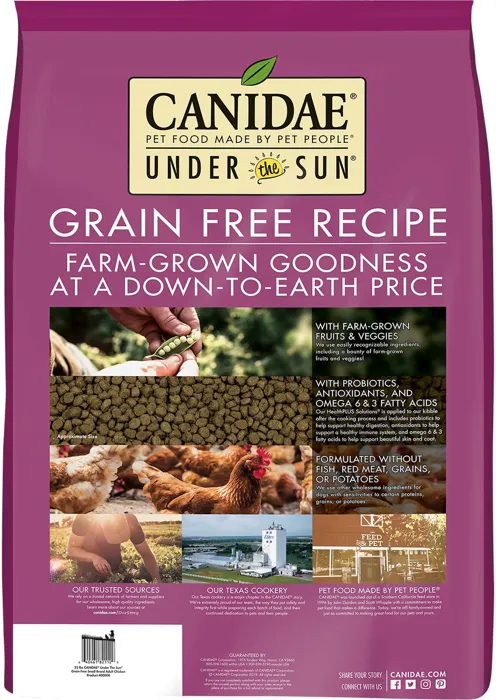 Make the smart choice with Under the Sun Grain Free Large Breed Adult Chicken Recipe Dry Dog Food. Based on the philosophy that good ingredients make good food, this grain-free and potato-free recipe is made in the USA with a single animal protein for sensitive pups with a bounty of fruits and veggies including peas, carrots, blueberries, butternut squash, pumpkin and more. And with probiotics to encourage healthy digestion, antioxidants to help support healthy immunity, and omega-3 and omega-6 acids to promote healthy skin and a shiny coat, you can feel good knowing that this recipe is just as