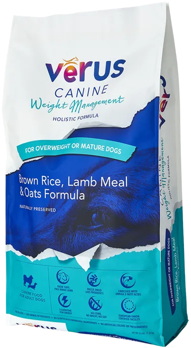Verus Weight Management Brown Rice, Lamb Meal & Oats Holistic Formula is designed for seniors and for healthy weight control.