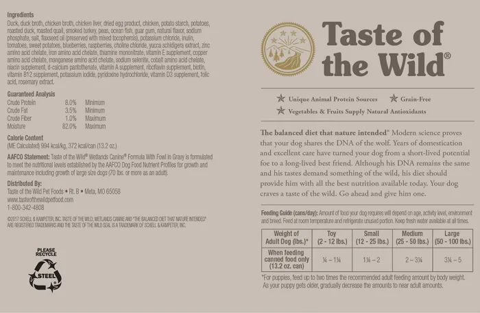 Feed your canine companion's wild side with Taste of the Wild Wetlands Grain-Free Canned Dog Food! Featuring real duck as the very first ingredient along with roasted quail and smoked turkey, this delicious and nutritious, grain-free food includes real peas, potatoes and sweet potatoes that deliver the highly-digestible energy your active pooch needs to thrive. Tomatoes, blueberries and raspberries offer natural antioxidants to support overall health and immunity. Plus, essential vitamins and nutrients are added to provide complete and balanced nutrition with a taste of the wild your furry friend constantly craves!
