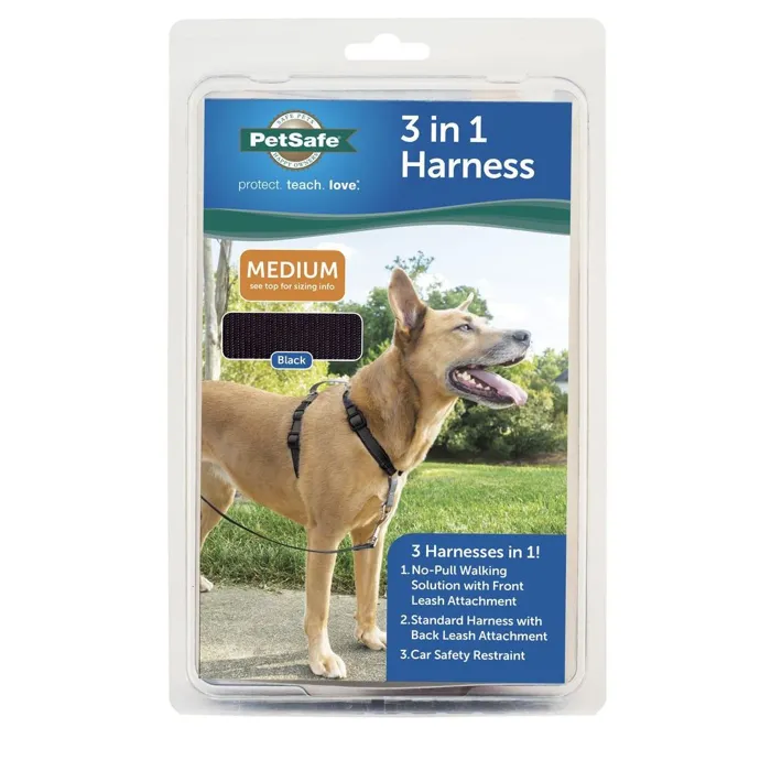 The PetSafeยฎ 3 in 1 Harness is the perfect all-inclusive harness. Designed for maximum comfort, adjustability and safety, the 3 in 1 Harness is great for everyday use. With different leash attachment options, the 3 in 1 Harness can be used as a standard back clip or a no-pull solution with the front clip option. It also features a car safety restraint option to limit your dogโs movement in the car, creating a safer driving environment for the pet, driver and passengers. PetSafeยฎ brand is here to help you and your pet live happy togetherโข.