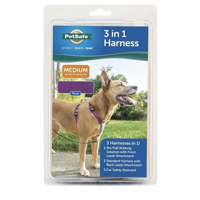 The PetSafeยฎ 3 in 1 Harness is the perfect all-inclusive harness. Designed for maximum comfort, adjustability and safety, the 3 in 1 Harness is great for everyday use. With different leash attachment options, the 3 in 1 Harness can be used as a standard back clip or a no-pull solution with the front clip option. It also features a car safety restraint option to limit your dogโs movement in the car, creating a safer driving environment for the pet, driver and passengers. PetSafeยฎ brand is here to help you and your pet live happy togetherโข.