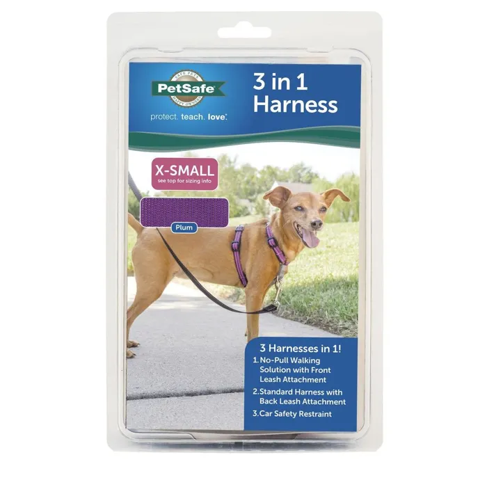 The PetSafeยฎ 3 in 1 Harness is the perfect all-inclusive harness. Designed for maximum comfort, adjustability and safety, the 3 in 1 Harness is great for everyday use. With different leash attachment options, the 3 in 1 Harness can be used as a standard back clip or a no-pull solution with the front clip option. It also features a car safety restraint option to limit your dogโs movement in the car, creating a safer driving environment for the pet, driver and passengers. PetSafeยฎ brand is here to help you and your pet live happy togetherโข.