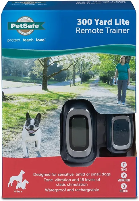 If your pet pooch is a sensitive, shy introvert or a self-assured little dog who needs to learn some social graces around the house or in the backyard, the PetSafeยฎ 300 Yard Lite Remote Trainer can help you gently correct their behavior with the push of a button. The trainerโs digital remote and collar allow pet parents to train their shy tail-waggers off-leash and help stop them from lunging, digging, chewing and other unwanted canine conduct. Safely improve your dogโs behaviors within a 300 yard range using tone (beep), vibration or 1-15 adjustable levels of static stimulation. Thereโs a safety lock feature for higher levels. The waterproof remote and collar quickly charge within 2 hours using a USB cable (included) and have a battery life up to 40 hours. The lightweight digital remote is easy to read and features 2 separate buttons for tone, vibration and static stimulation. The waterproof training collar fits dogs 8 pounds and up, with neck sizes 6-23 inches. PetSafeยฎ brand is here to help you and your pet live happy togetherโข.