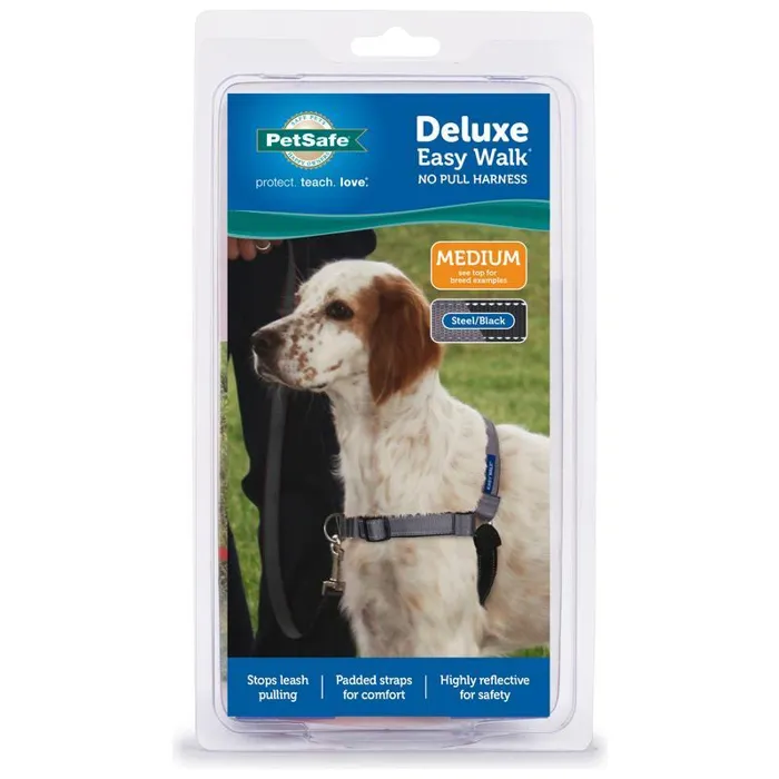 Easy to fit and comfortable to wear, the PetSafeยฎ Deluxe Easy Walkยฎ Harness gently discourages your dog from pulling on the leash. The front-chest leash attachment helps you steer your dog to the side and redirect his attention toward you. The Deluxe Easy Walkยฎ Harness provides the same great benefits as the traditional version, but has additional features such as neoprene lined straps and highly visible, reflective strips.